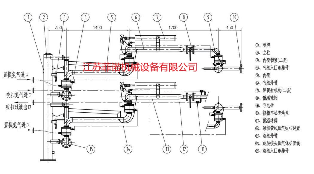 應(yīng)采用底部密閉帶回氣管線形式,而且是屬于低溫鶴管,鶴管型號(hào)一般為AL2543或AL2503,字母AL代表陸用液體裝卸臂,第一位數(shù)字2代表底部裝卸,第二位數(shù)字5代表液相管的旋轉(zhuǎn)接頭數(shù)量為5,第三位數(shù)字4代表氣相管為上翻式,第四位數(shù)字3代表液相管形式為下翻式。